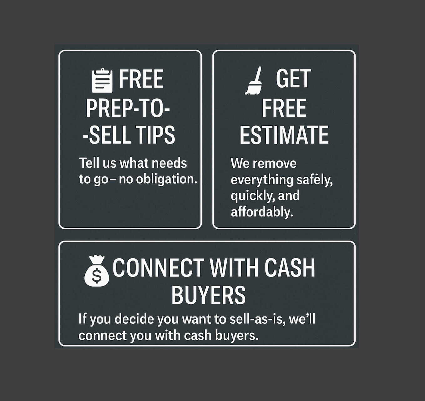 We remove everything safely, quickly, and affordably.๐ฐ CONNECT WITH CASH BUYERS. We'll connect you if you decide you want to sell-as-is and move out fast.